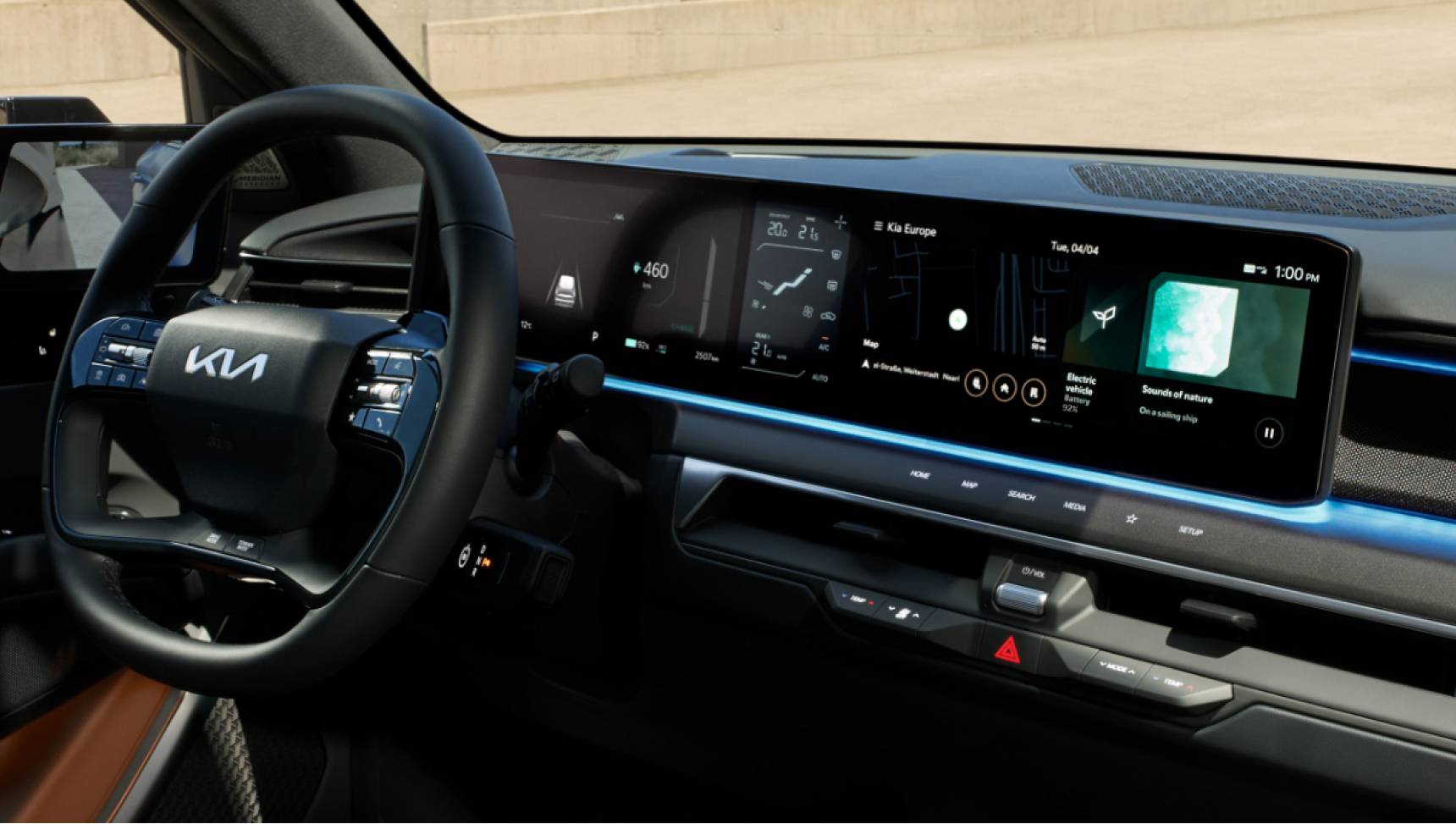 Während der Fahrt bringen integrierte LEDs das Kia-Emblem in der Mitte des Lenkrads zum Leuchten. Ein echter Hingucker, der den stilvollen Innenraum des neuen EV9 GT-line perfekt abrundet.
